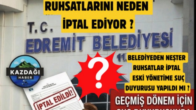 EDREMİT BELEDİYESİ’NDE YENİ DÖNEMLE BİRLİKTE BAŞLATILAN İNCELEMELER SONUCUNDA ÇOK SAYIDA İŞ YERİ RUHSATI İPTAL EDİLDİ. ANCAK BELEDİYENİN, ÖNCEKİ DÖNEM YÖNETİMİ HAKKINDA ŞU ANA KADAR HERHANGİ BİR SUÇ DUYURUSUNDA BULUNUP BULUNMADIĞI MERAK KONUSU.